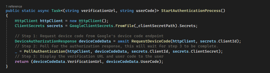 To handle this, we need an OAuth flow that enables the user to authenticate the server using their browser. For this purpose, I implemented Google’s "TVs and Limited Input Devices" flow, which is designed for devices with restricted input or display capabilities.